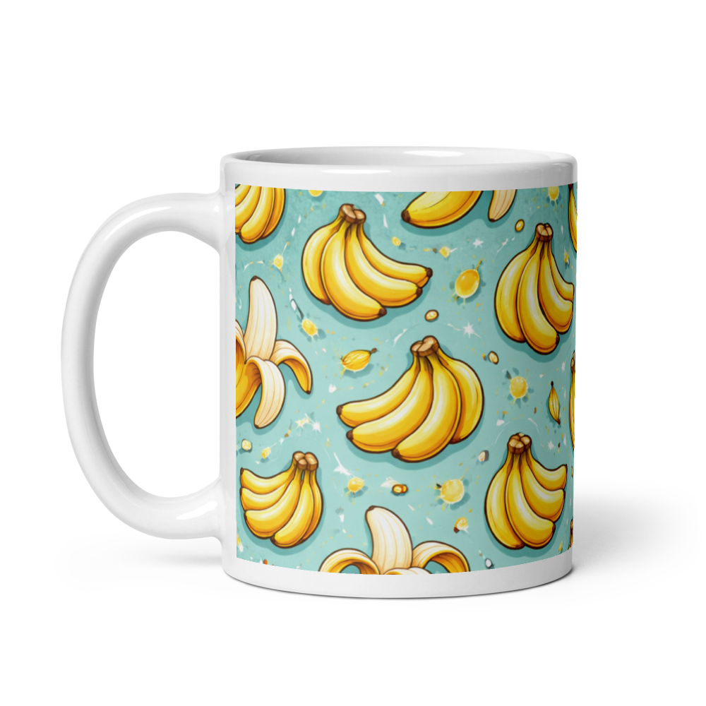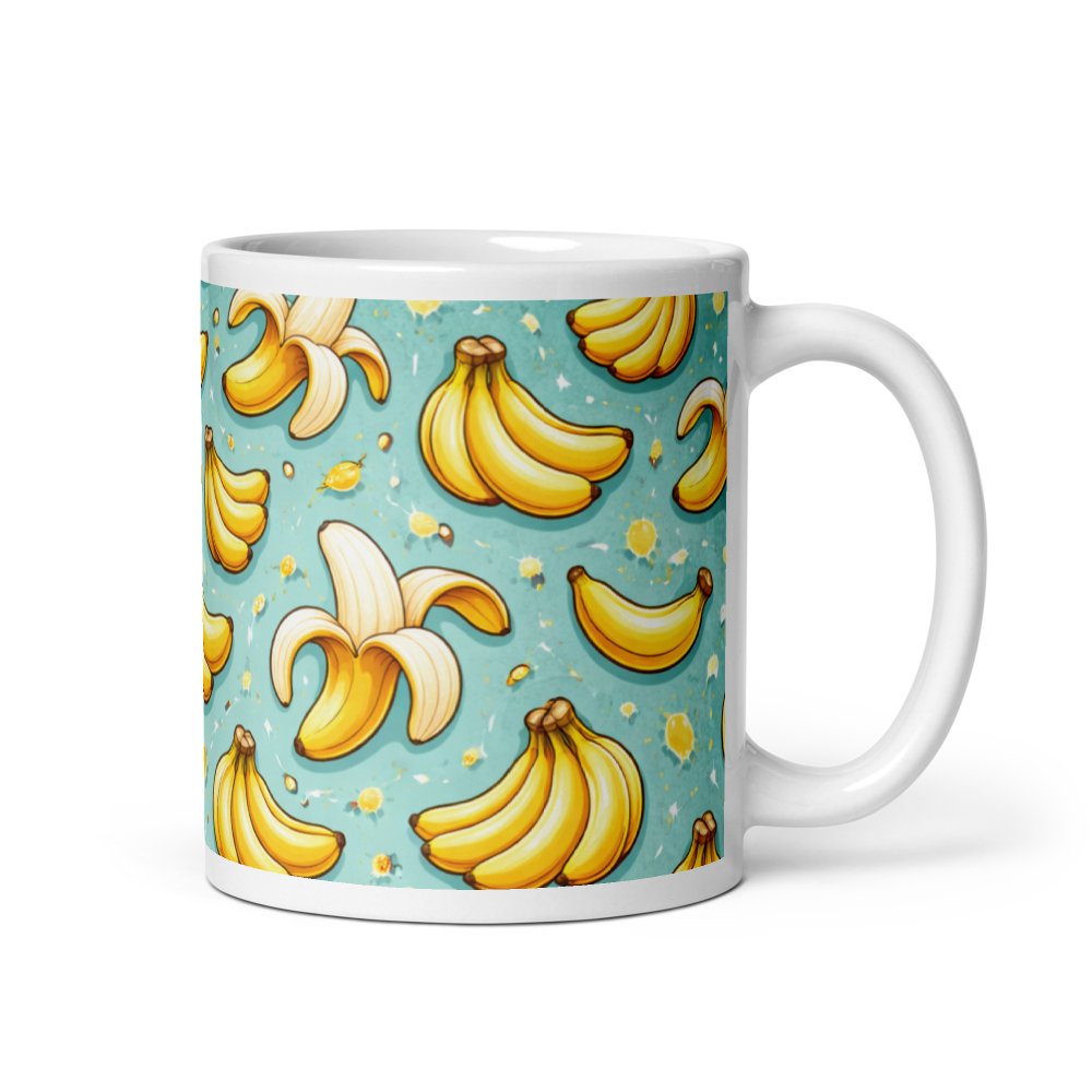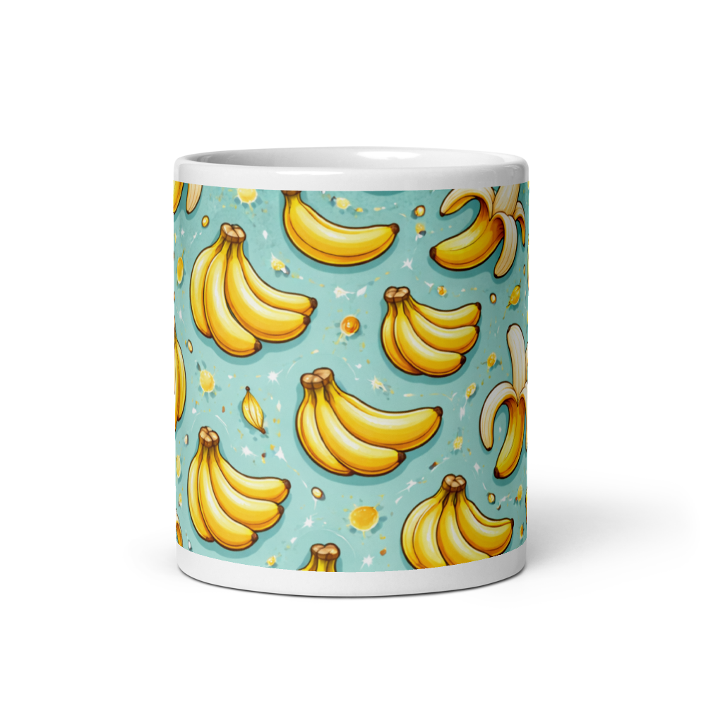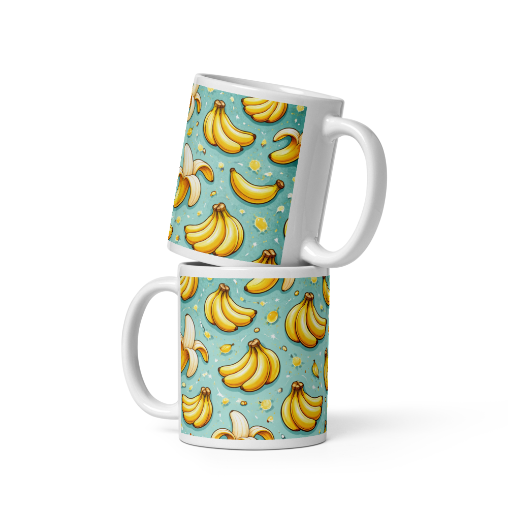 Son design met en scène un motif répétitif de bananes, soigneusement illustré pour créer un rendu harmonieux, dynamique et plein de fraîcheur sur toute la surface du mug.